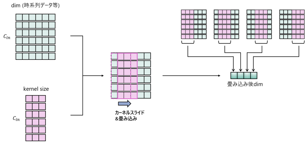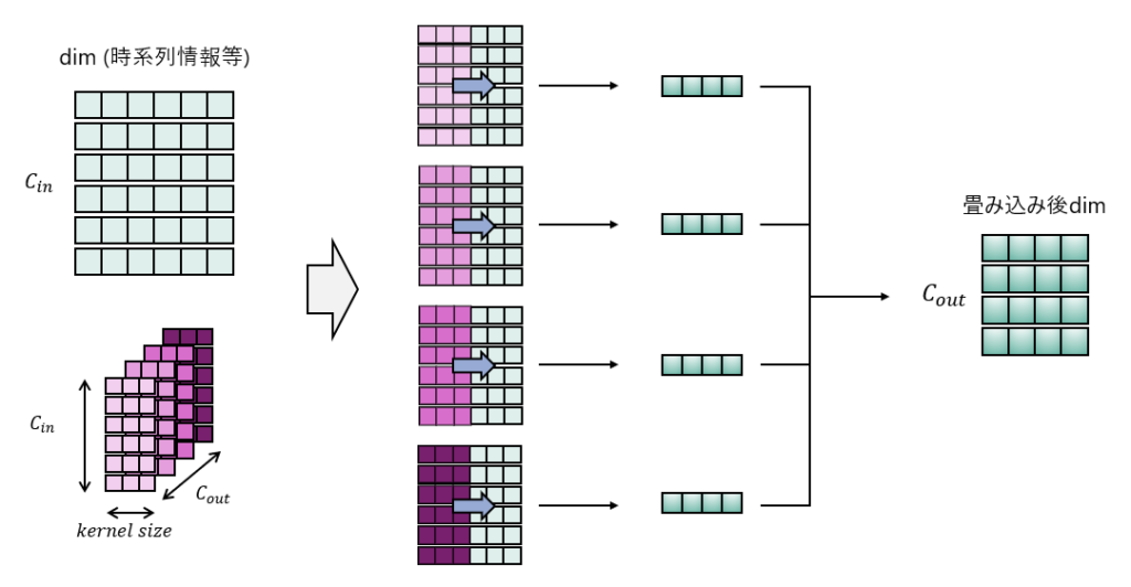 以下の図に示すように時系列方向への畳み込みを行い、時系列の局所的な特徴を抽出します。