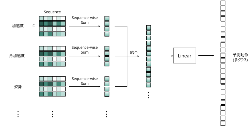 - 各処理結果を連結して一つの特徴量ベクトルにまとめてLinearに入力