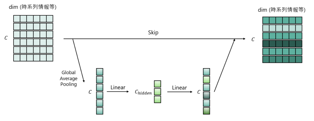 チャネルだけにして、全結合を通してチャネルの関係性を学習して、元データに関係性(重み)を掛け合わせるというものです。