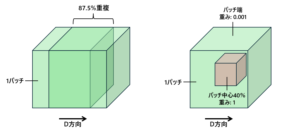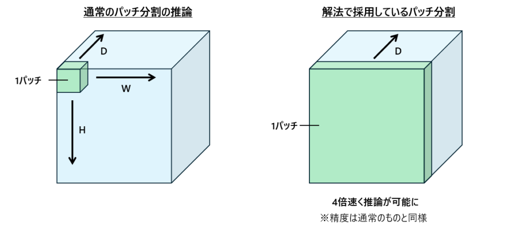 最終的に下図の右側にあるようにH, W方向のパッチサイズを大きくしてD方向にのみスライドするようにしたことで精度維持したまま推論速度を4倍にすることができた。
